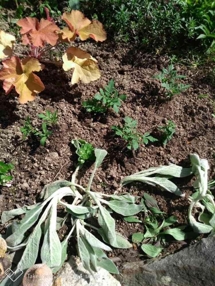 芝桜をはがして、ラムズイヤーと、アジュガを移植しました。。それでもスペースがあったので種から育てたマリーゴールドと、挿し木して根がでたバコパを植え付けました。