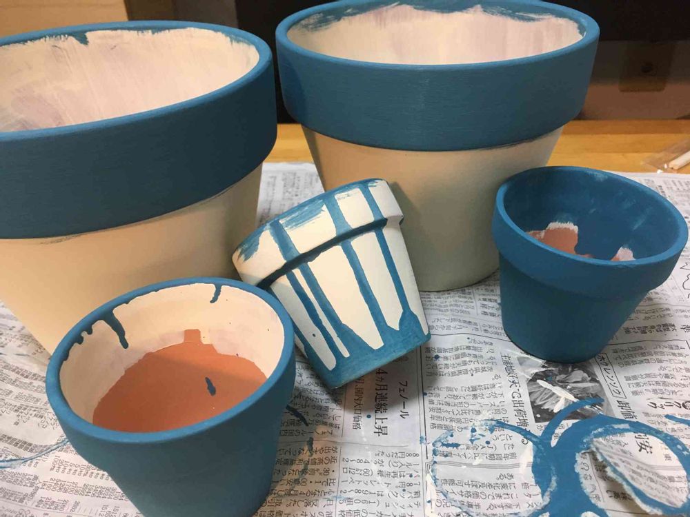 早速、ダイソーで素焼きの鉢を買ってきて、好きな色に塗ってみました。白い部分は乾燥するとクリーム色になる予定です。