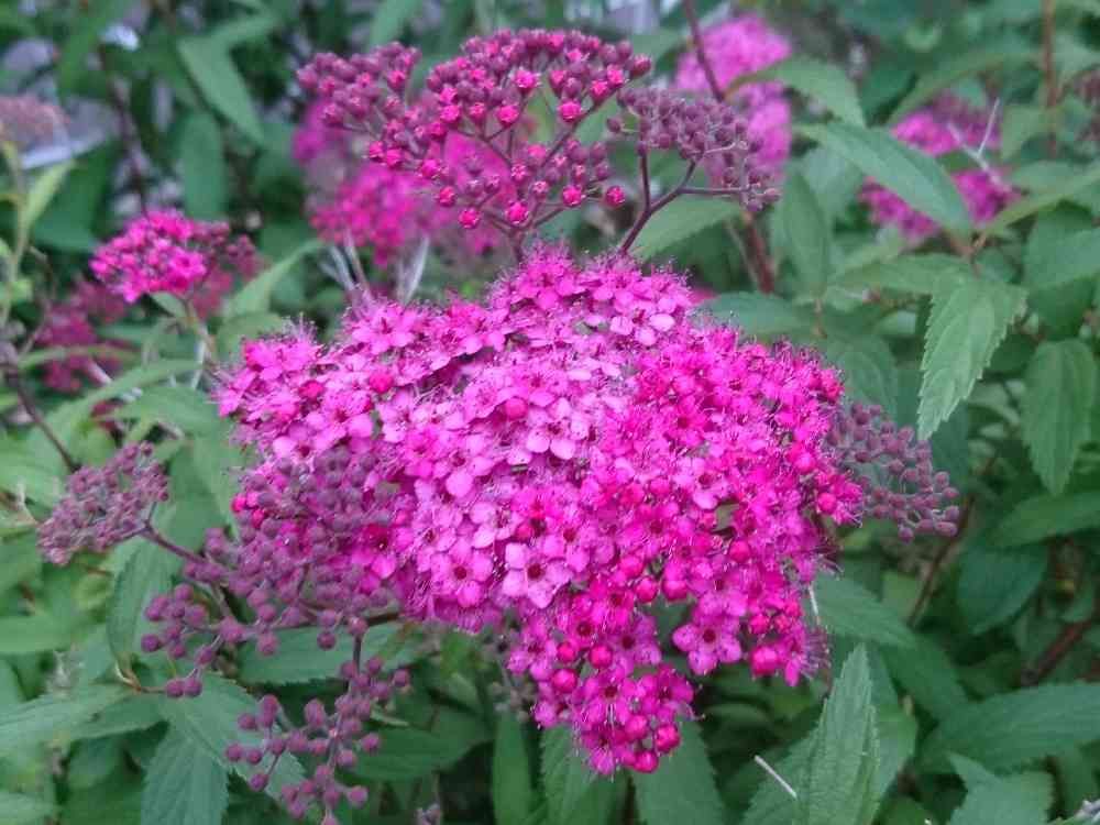 先週からみるみるうちに咲いてきた。みんなの花図鑑でピンク色の花を探してみたら、『シモツケ』という花に良く似ていました。
