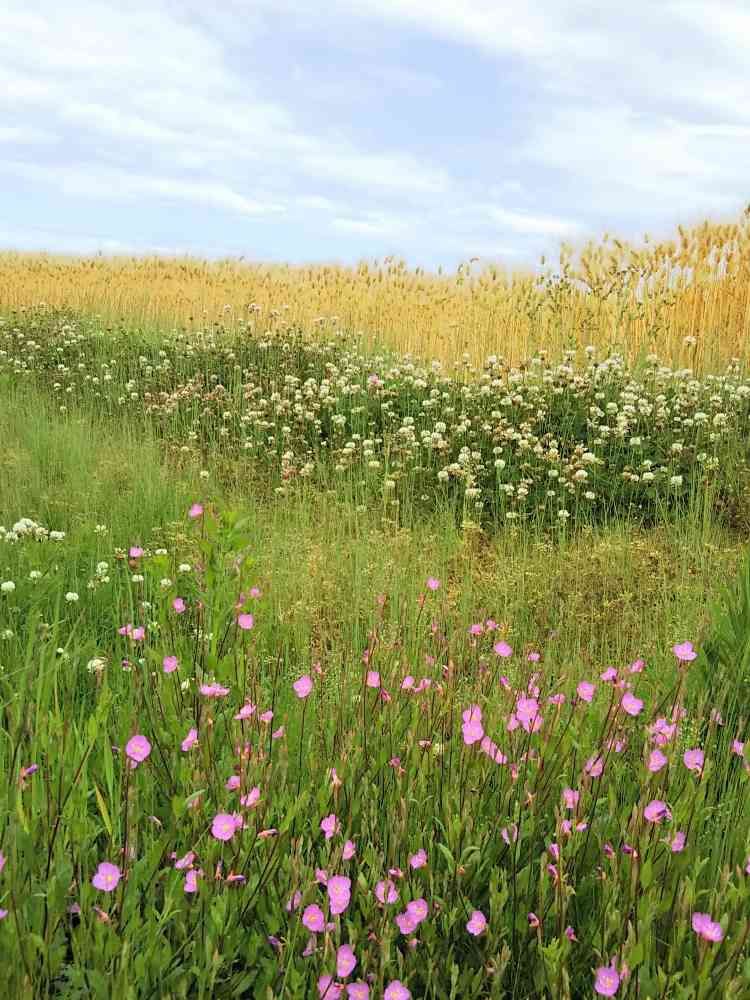 帰り道、麦畑に惹かれて散策すると、麦畑のあぜ道に白つめ草とピンクの可愛い花と麦と空が絵のようでパチリ✨!。