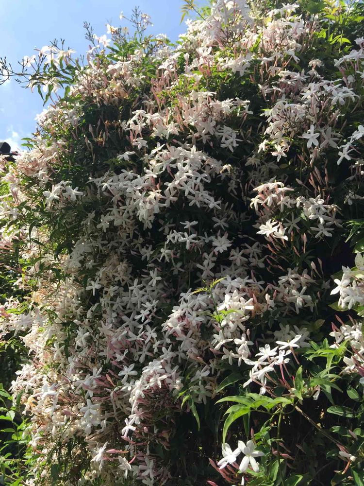 庭の大株ハゴロモジャスミンが花盛りです。ちょっと匂いがきついくらい。