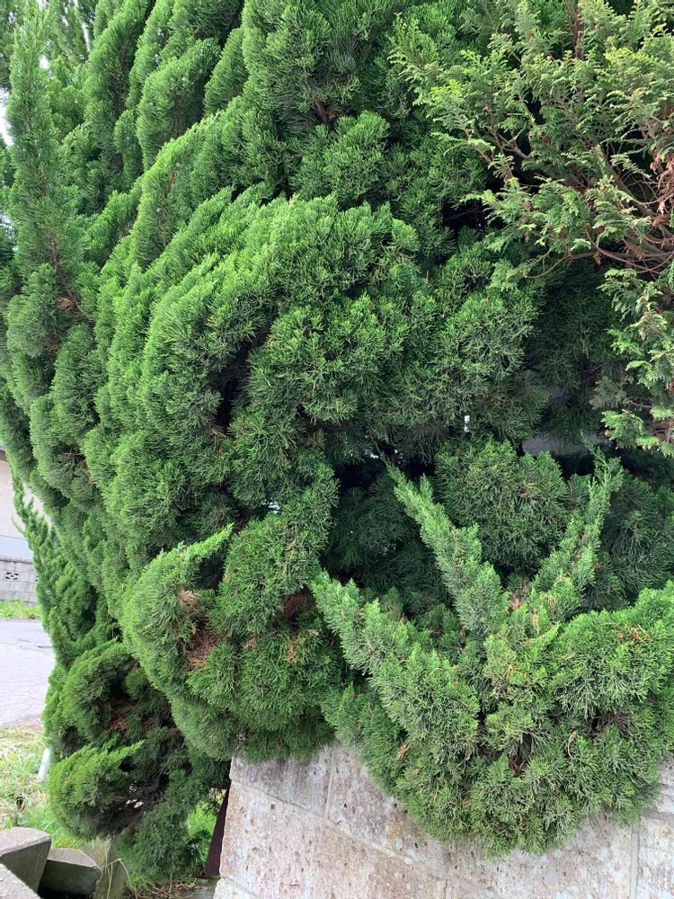 ブロック塀からモリモリはみ出している貝塚息吹(カイヅカイブキ)。