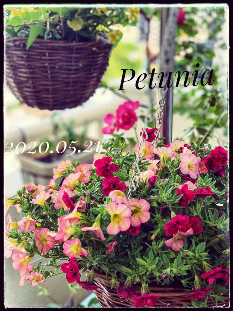 ペチュニアの寄せ植えハンギングしてみました☺️。目の高さにお花があるのっていいですね💓。