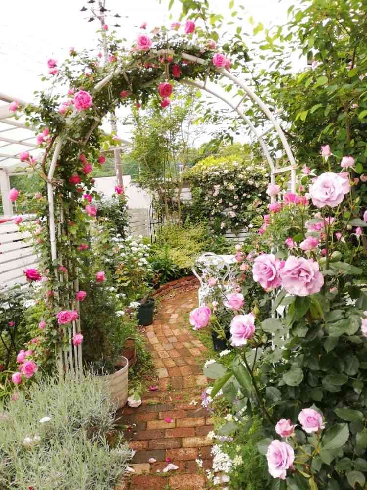 とても素敵なお庭💗バラが咲き誇るお庭のアーチをくぐるレンガの小道の曲線✨とても素敵な雰囲気ですね✨✨