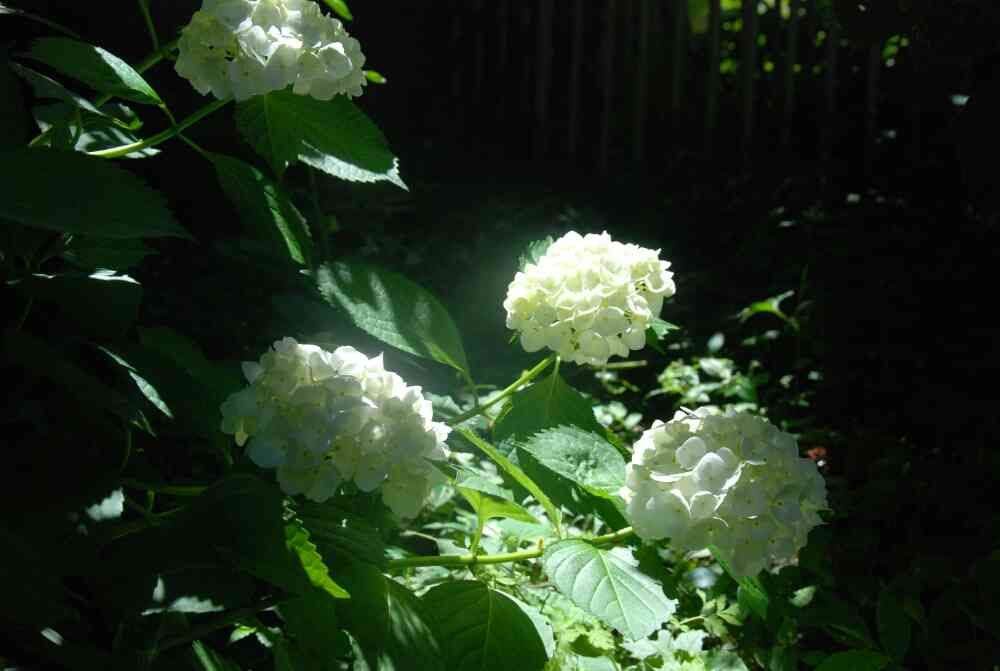 雨の後、庭のアジサイに太陽の光が差し込んだところです。