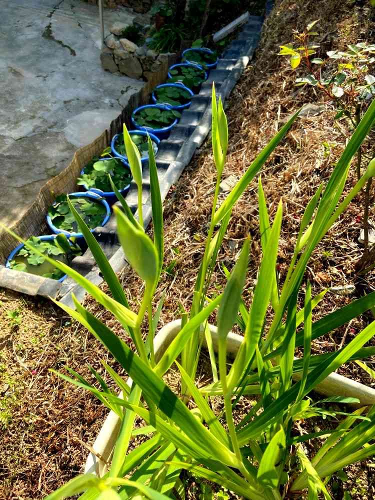 雀の庭で朝陽を浴びている花菖蒲。