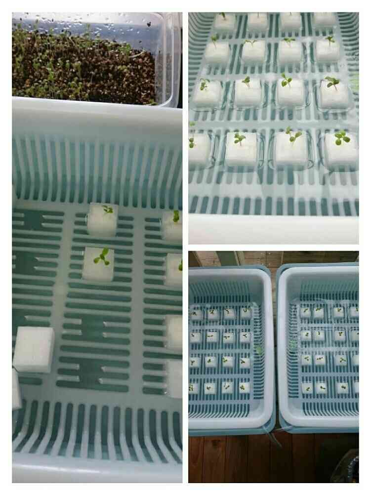 筋播きしたサラダミックス、間引きするのは勿体ねーと水耕栽培試作2号機へ植え替えてみた(←旦那が)