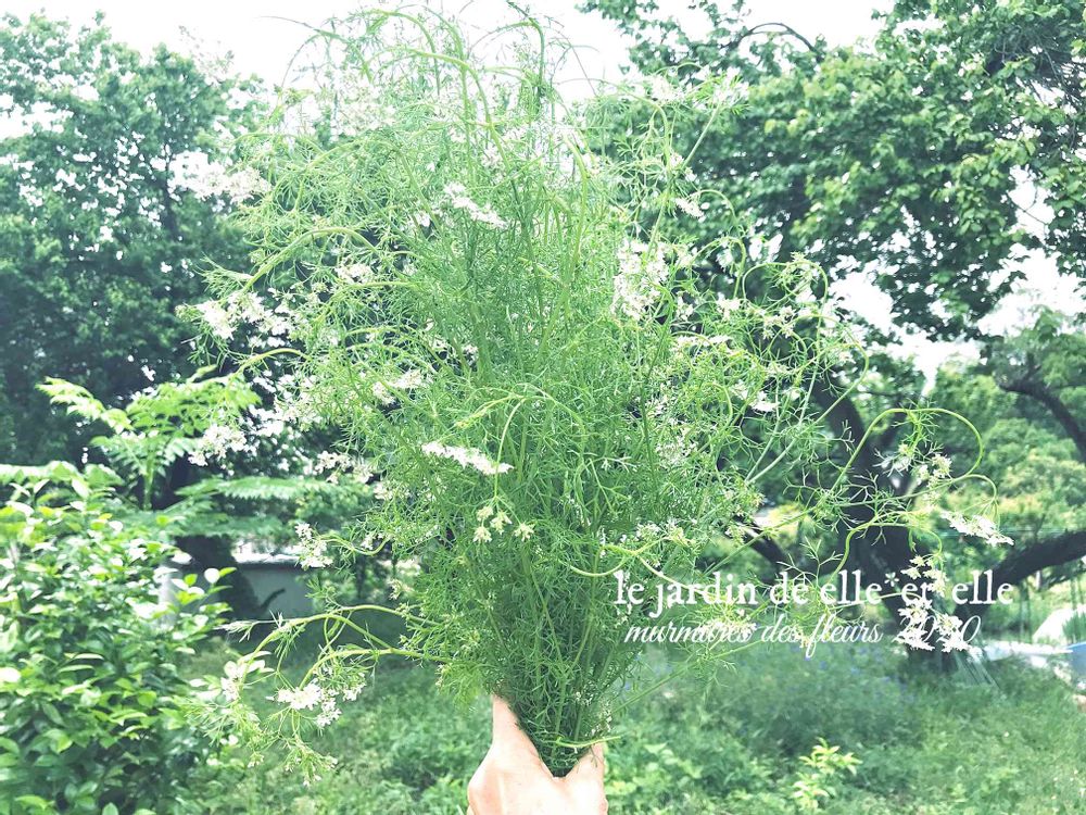 パクチーの花ってわさっと飾るととても可愛いんだけれど、パクチーの匂いが苦手な子供達に不評なのであまり大量に飾れない💦