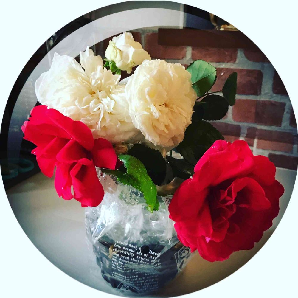 庭に咲いたバラが重そうにしていたのでリビングのカウンターに…。