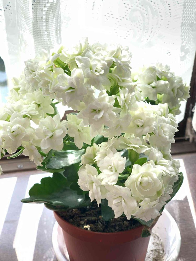 [@id:1306135] さん、こんにちは!このカランコエはフツーのとは違って大輪のようです。八重咲きなのかな?本当眩しいくらい白いです💕