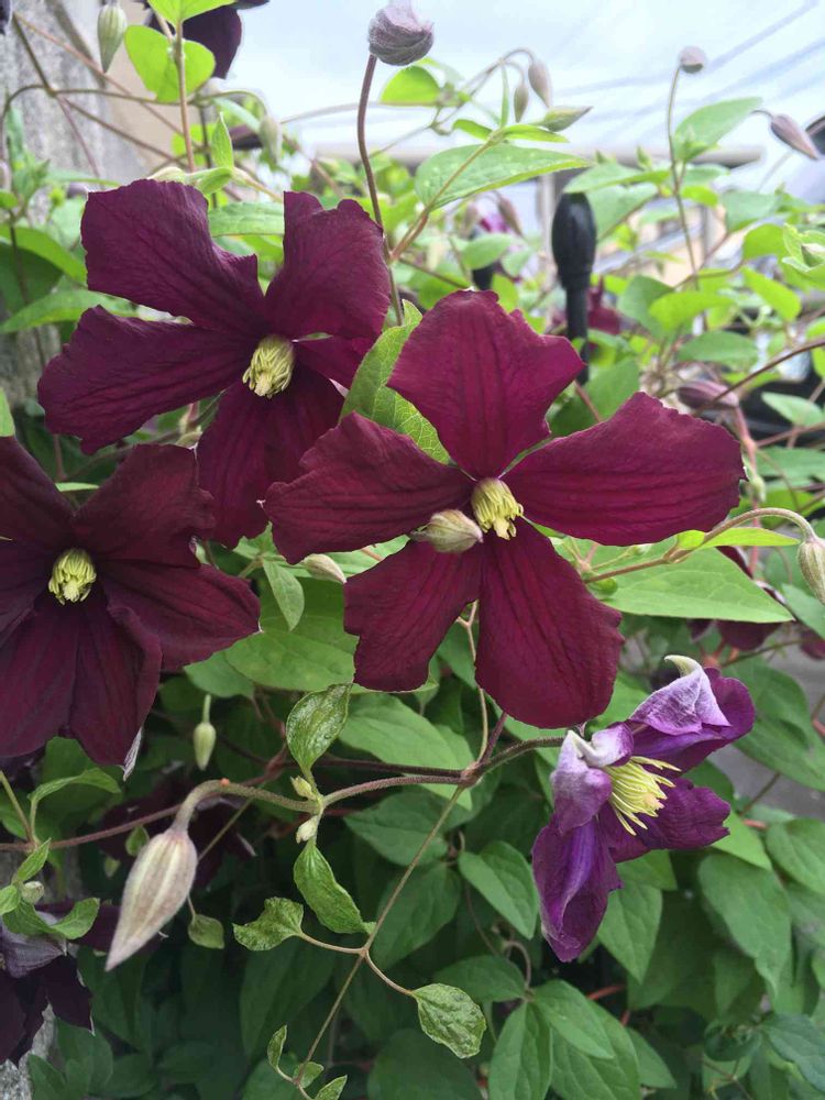 今日投稿されてたクレマチスですかね😊ロウグチだけ名前出てて、この子はマダムジュリアコレボンかなと思いながら見てました✨同じヴィチセラ系で姿などよく似てます。マダムジュリアコレボンはワインレッド、エトワールバイオレットは濃紫色です。ちなみに私もマダムジュリアコレボン育ててますよ♫今は蕾で開花はもう少し先っぽい😅