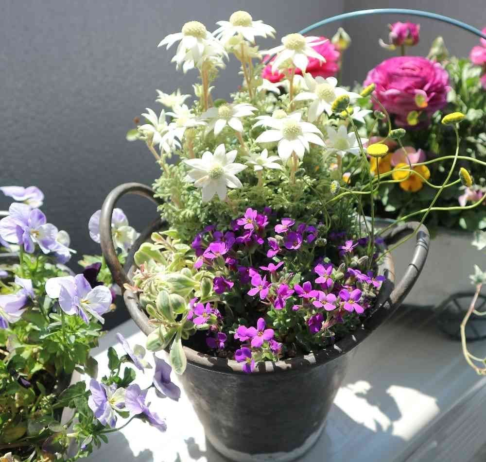ブリキの鉢なのかな? 「おうち園芸」にピッタリな感じがするよ(^^) それにフランネルフラワーがお日様をたっぷり浴びて気持ち良さそうだね(*^^*) すえちゃんらしい寄せ植えで見ていて安心する(^^♪