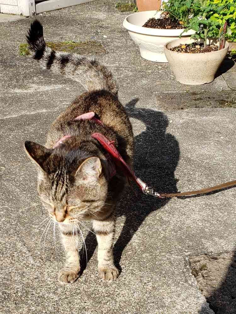 うちのねこさんは常にこのスタイルなのですが、リードが引っ掛かったりしてハーネスがスポッとなると自由の身になれます😅