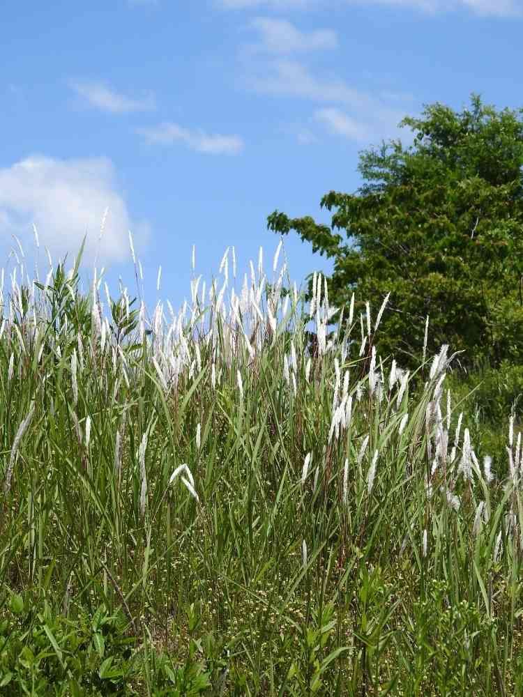 住宅街の空き地で💮咲く青空に映える綺麗なチガヤ🤩