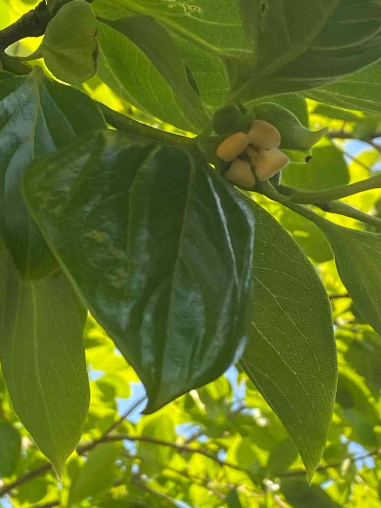 柿の木に花を見つけました。青空に柿の葉がキレイです。