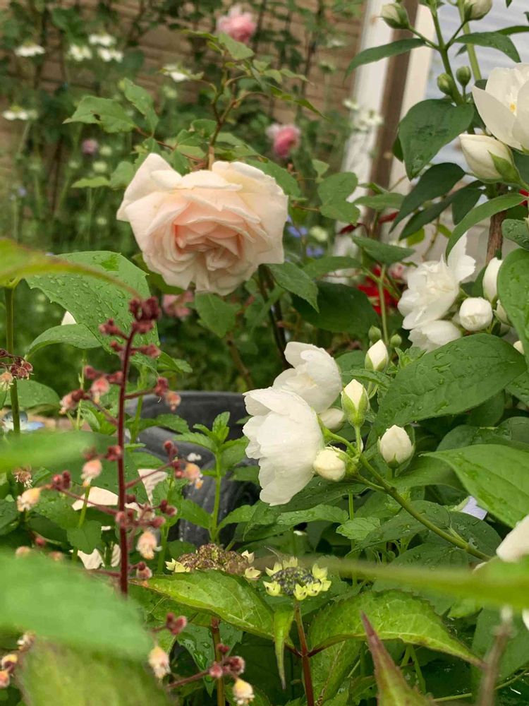 何度見ても梅花空木の丸っこさが可愛いねꈍ◡ꈍ♡バラさん達やヒューケラさんとのお花会議参加してみたいね💖