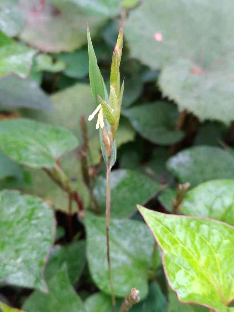 ドクダミと蕗の間から生えてきた笹に、花が咲いてました!