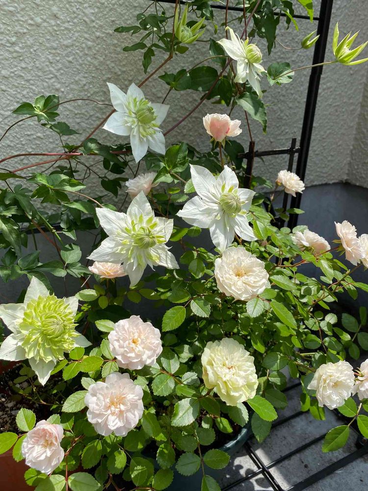 バルコニー/ベランダ,クレマチス 白万重,ミニ薔薇グリーンアイスの投稿画像