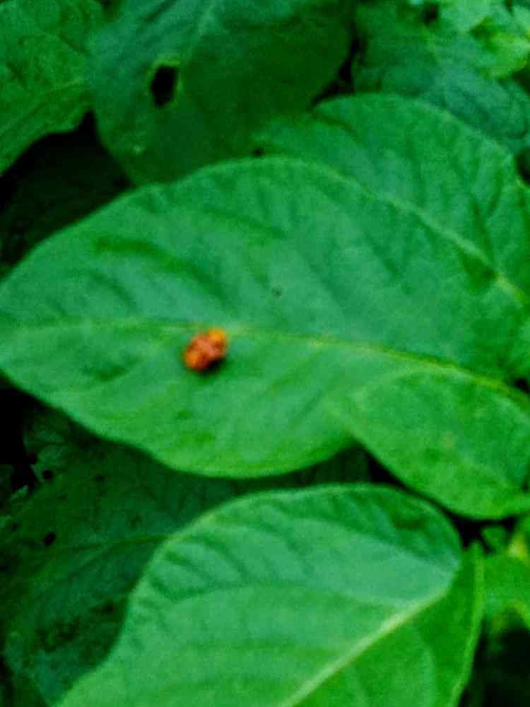 朝取れ🍅を買いに行った帰り道、通り道の畑に、てんとう虫🐞が、止まっていました。