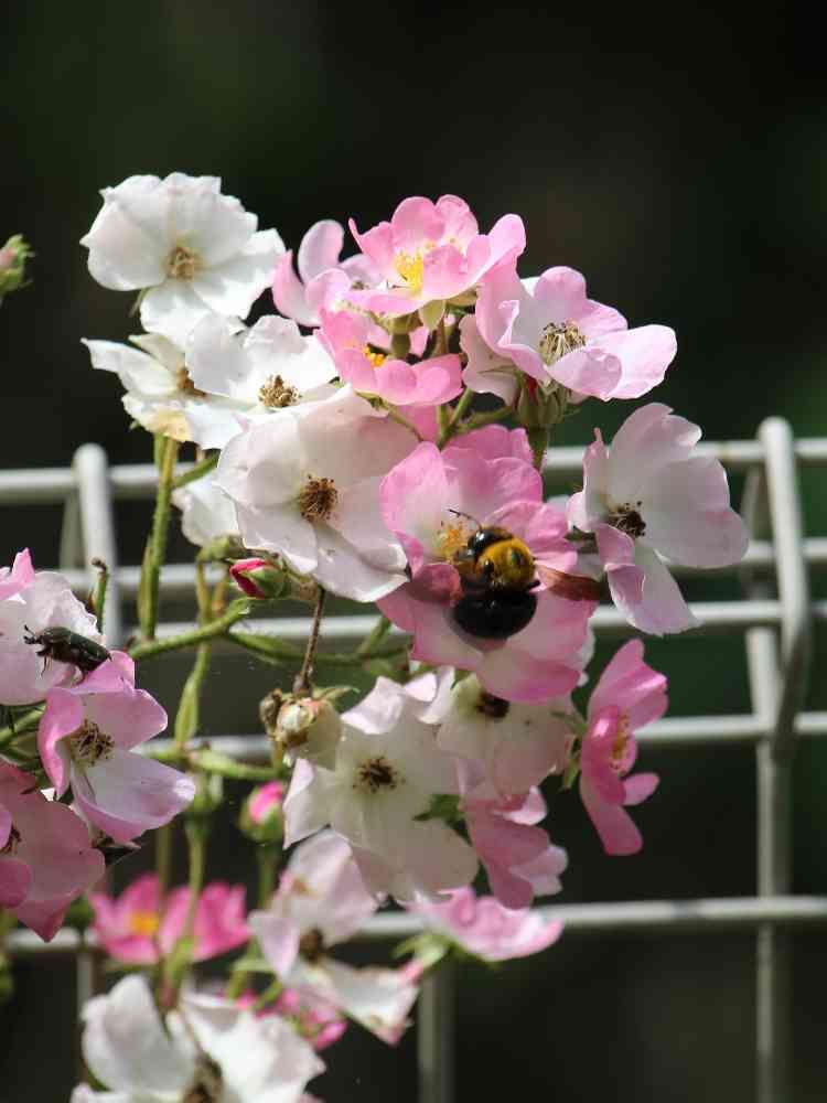 お庭のミニ薔薇にクマバチさんがいらしてます♪