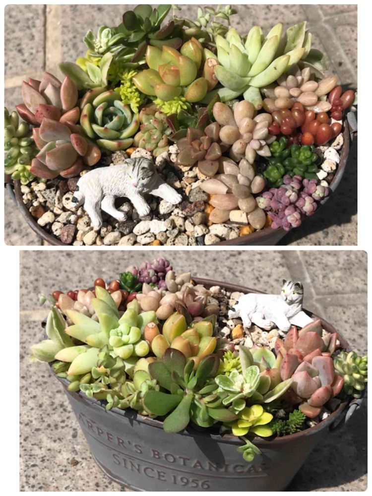 猫ちゃんの置き方で寄せ植えの感じ変わるね〜