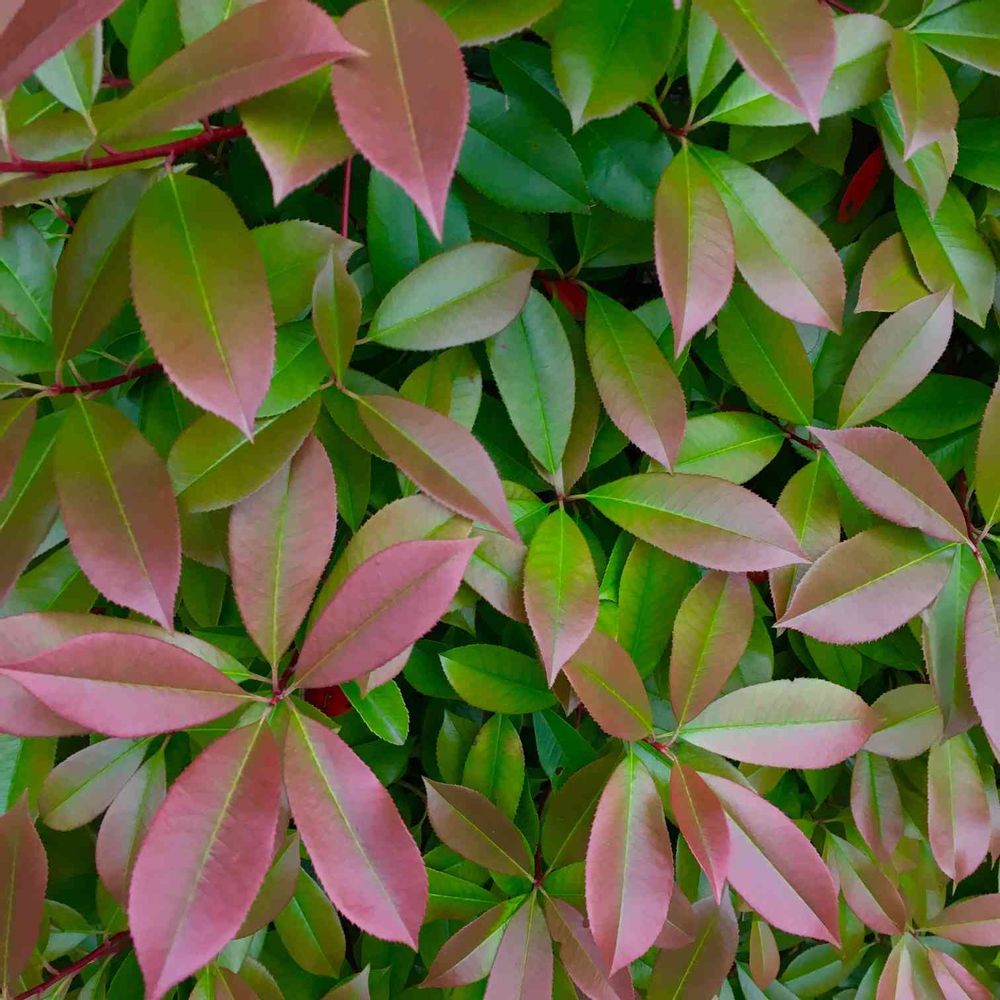 近所の生垣、ベニカナメモチ(レッドロビン)の新芽が、真っ赤から緑に変わってきた。グラデーションがキレイだな〜