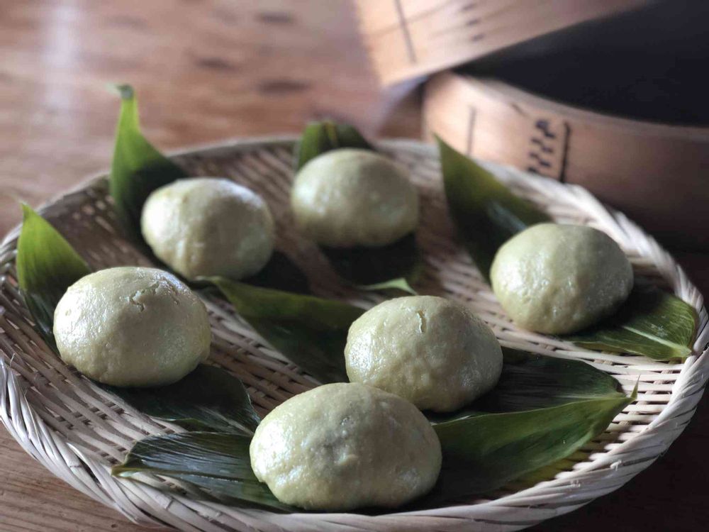 蒸籠には 庭から採って来た熊笹を敷いておまんじゅうを乗せています。