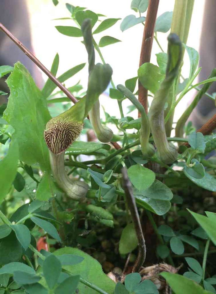 アリストロキア パルビフロラがヒメミヤコグサと雑草の間で密やかに咲いてました😊