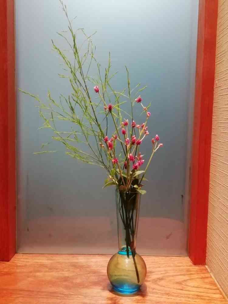 鉢で咲いていた花を活けてみました。アスパラは太い芽は食用に。細い芽は花瓶に。