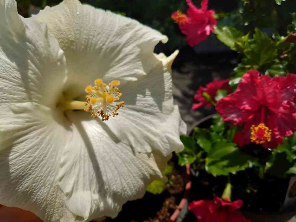 本日のハイビスカス🌺は2種類が咲きました✨ 純白の大輪、手のひらより大きくてとっても重そう😅 気温で色が変化する『レッドマジック』は小ぶりな花形です❗