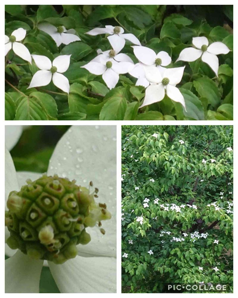 左下のヤマボウシのお花は 散歩道にある集合住宅の植え込みにあって そうは高い木でなかったのです。