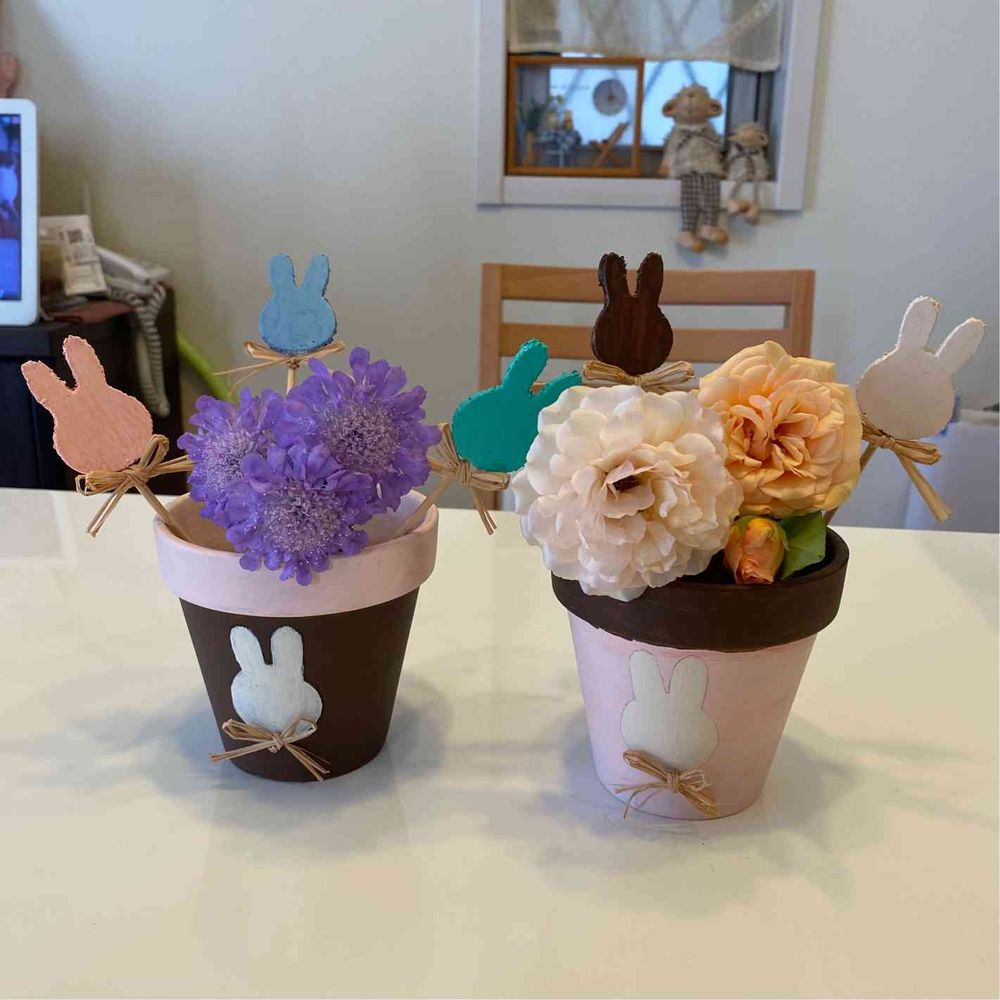 最初は、うさぴょんピックだけを作っていたんだけど、鉢が手に入ったのでピンクと茶色に塗りたい気持ちが抑えきれず、こんなの出来ました😅