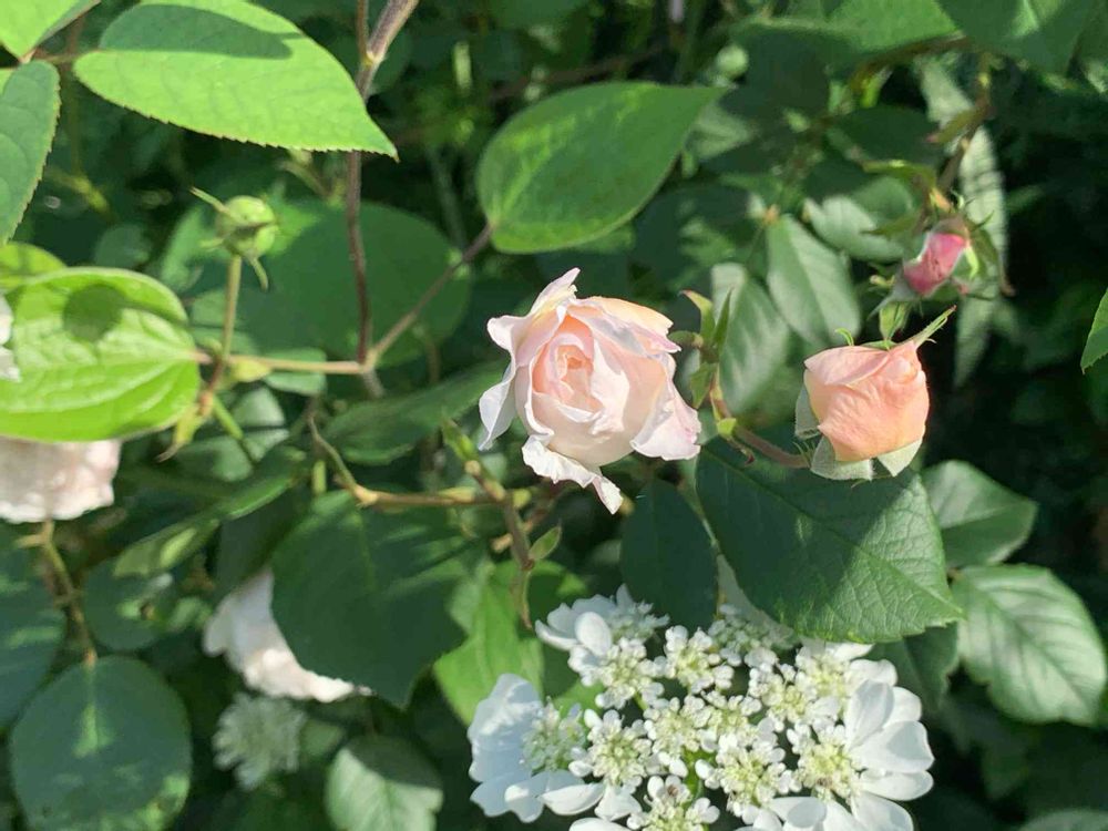オルブライトンランブラーは昨年、ボーダー花壇に迎えて、3メートル伸びるつるバラなのに四季咲き、淡いピンクといううたい文句にかなり期待してました😀日当たり、肥料、消毒と手をかけて育てたつもりでしたが、今年咲き出した花は白っぽく、つぼみも開かずに落ちてしまったり、隣のサマースノーの白と完全に被ってしまって、今ひとつだったかな‥と思ってました。でも、二番花が咲き出したら、期待通りのピンク🌸良かった☺️数年後には庭の主役になってくれるかな、と期待しています。