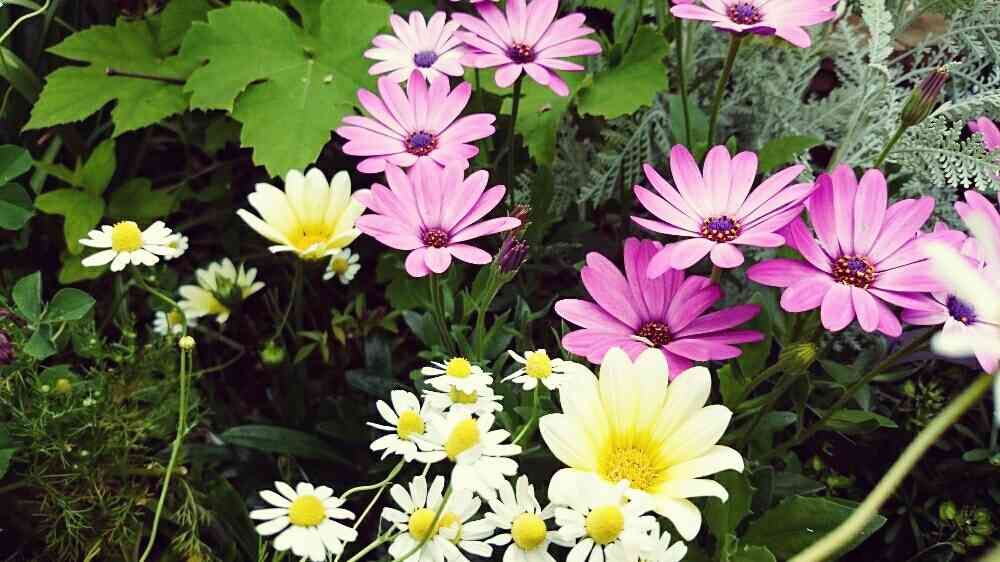 クリーム色のガザニアが咲いてきて、オステオスペルマムとカモミールとのコラボ始まりました(*^ー^)ノ♪