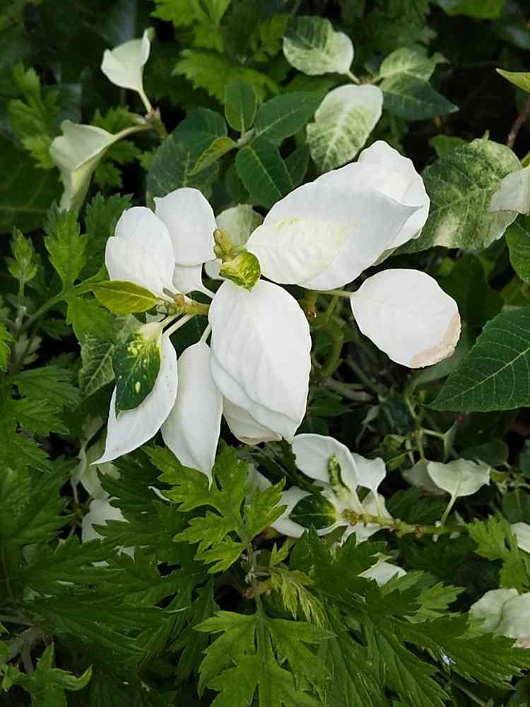 白い花の写真は、周りが飛んでしまうので。難しいけど、この写真で白いのは、花ではなくて、葉っぱのように見えます。そうすると、白いポインセチアとか、コンロンカ、ハンカチの木も候補になります。全体の大きさや、葉っぱがどんな形かが分かると、判断しやすいのですが。