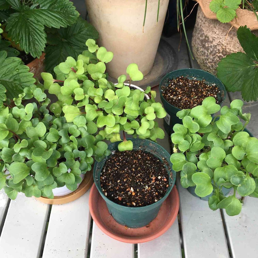 両側鉢共に収穫時になってしまいました。手前鉢、蒔いた種が膨らみ始めました。