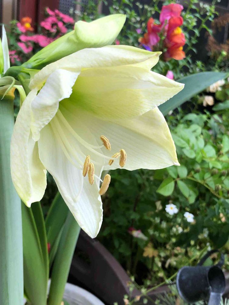 白のアマリリスって珍しいですね😃赤とかピンク色系をよく見かけるので😅白いと涼しげな感じで良いですね🎵
