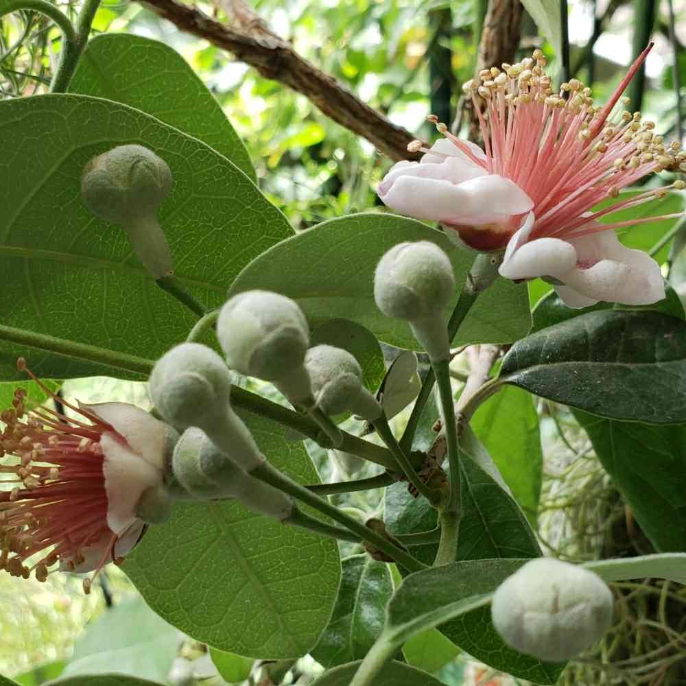 フェイジョアの雄しべと雌しべがは午前と午後に変化するらしく、確実に結実させたいときはひとつお花を取って冷蔵庫に保管して夕方に人工受粉すると結実に成功するとある文献で読んだことがあります。