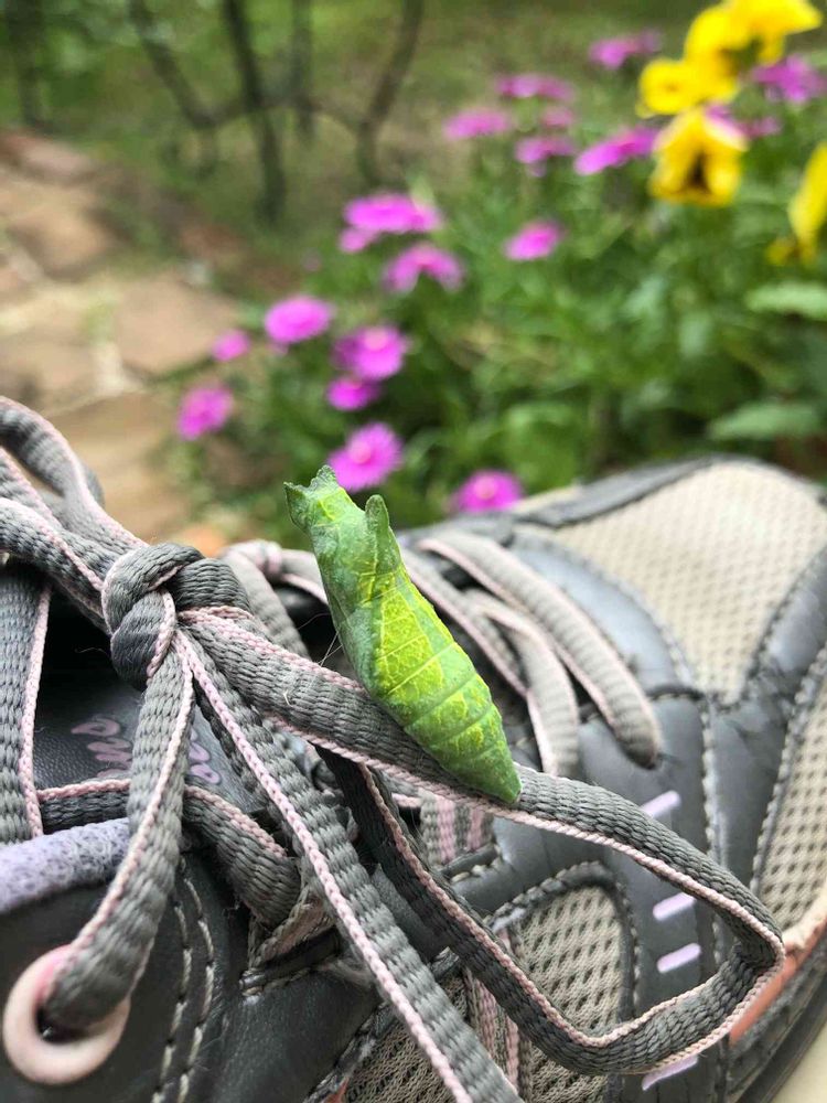 ベランダに置いてある運動靴の紐に、何故かサナギが⁉️