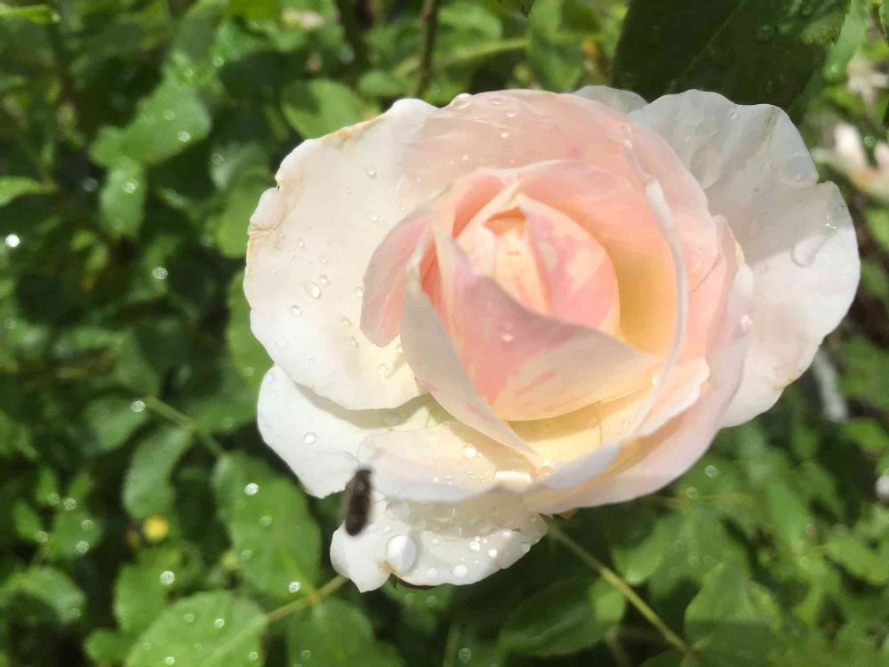 白にピンクのストライプが入り房咲ききでとっても美人なバラ🌹