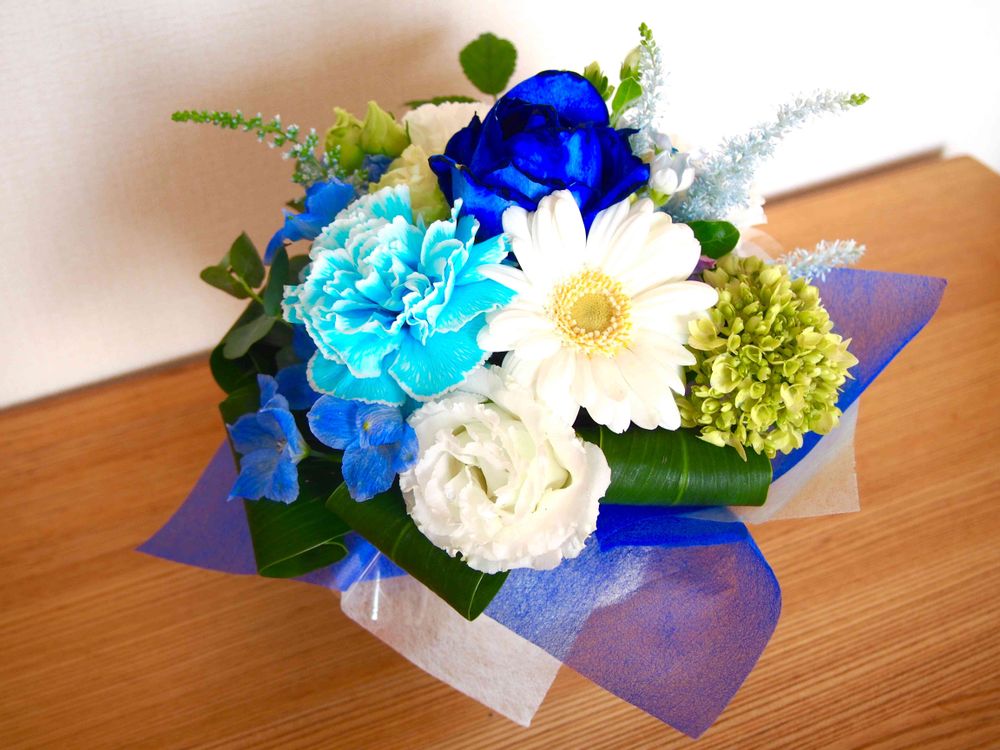 様 コメントありがとうございます!青い薔薇、やっぱり染めてますよね??こんな青いのみたことなくて💦青いお花大好きで買いました😘