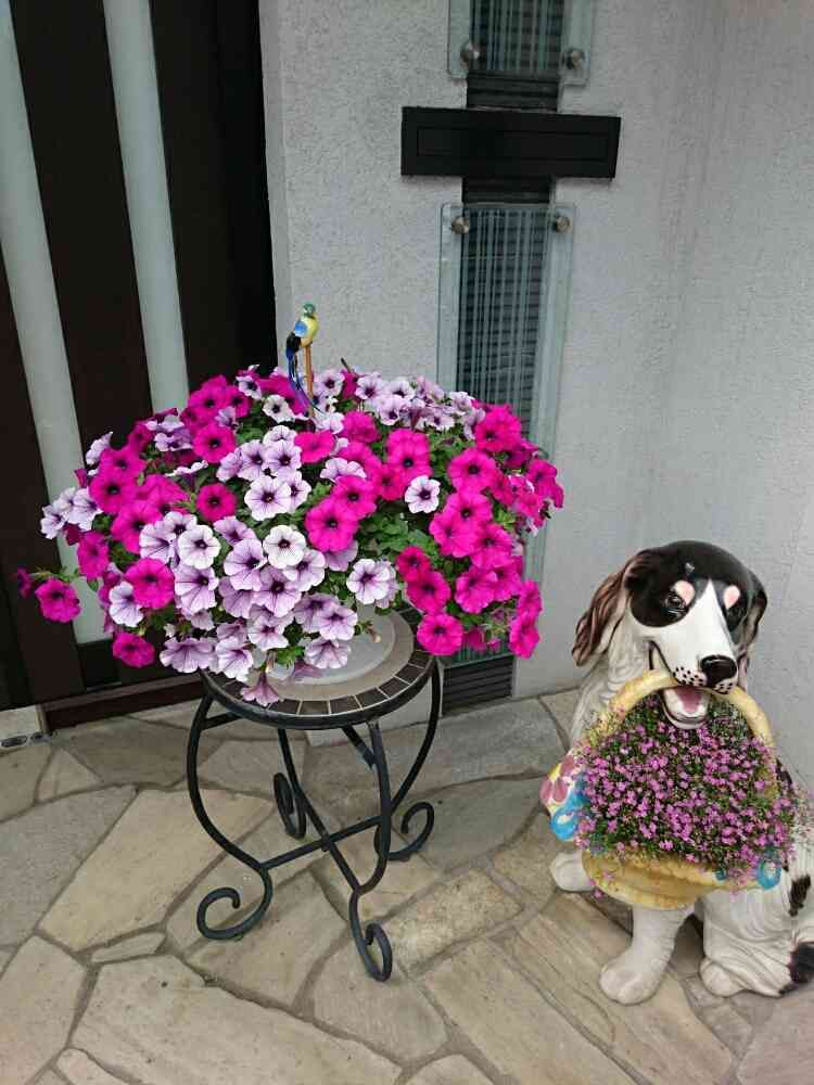 サフィニア2色植えが花数多くなったので門扉前に移動~。