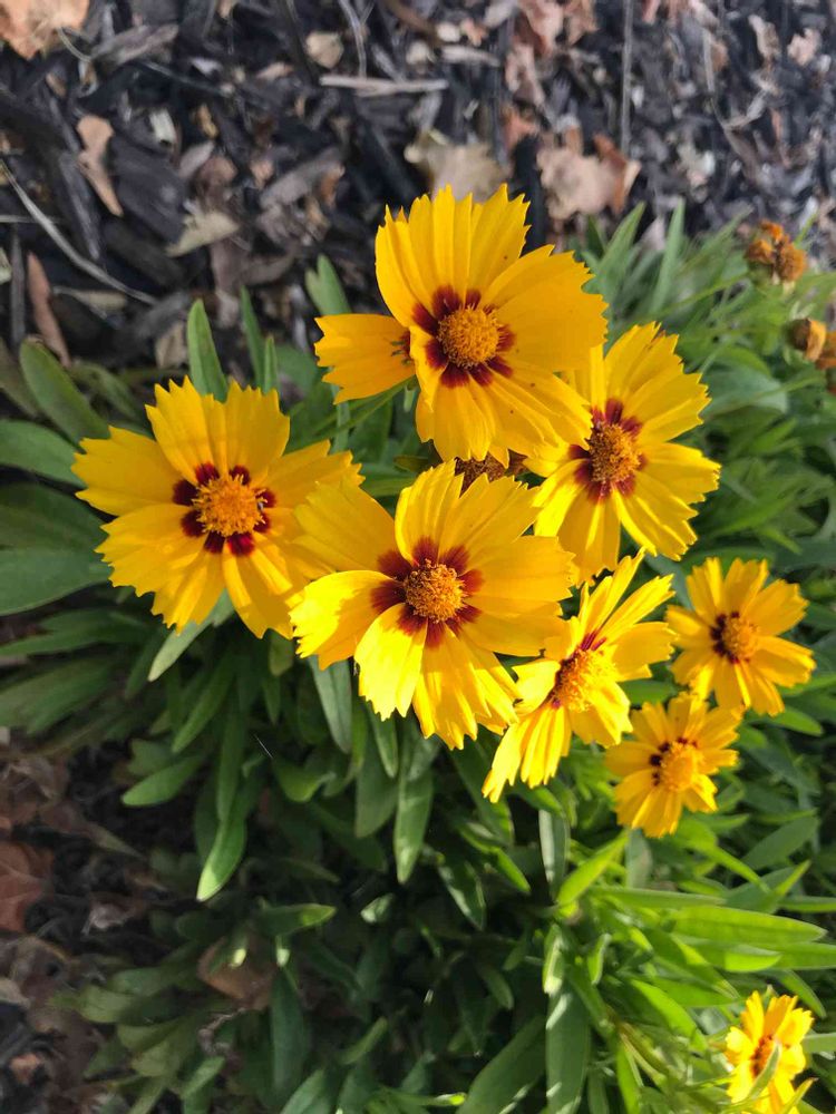 散歩コースの植え込みで鮮やかに咲いていたお花。背景が暗いウッドチップなので黄色が目立ちます。