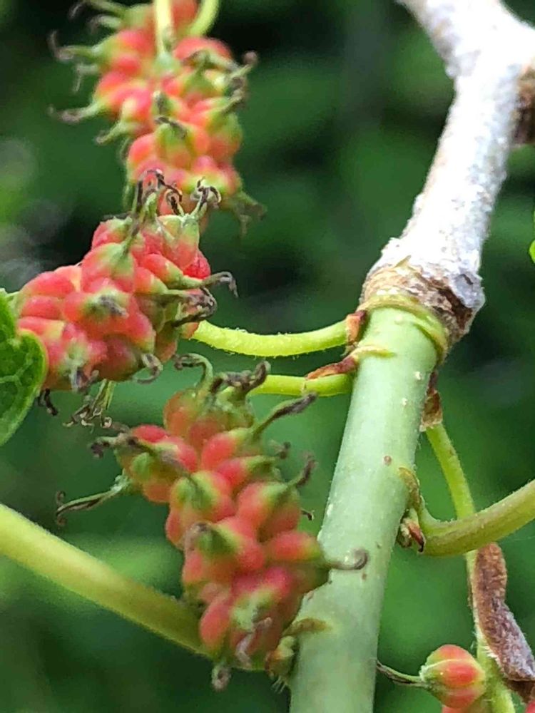 葉っぱ🌿を避けて、よく見てみると、まだ熟していない、たぶん「桑の実」⁉️