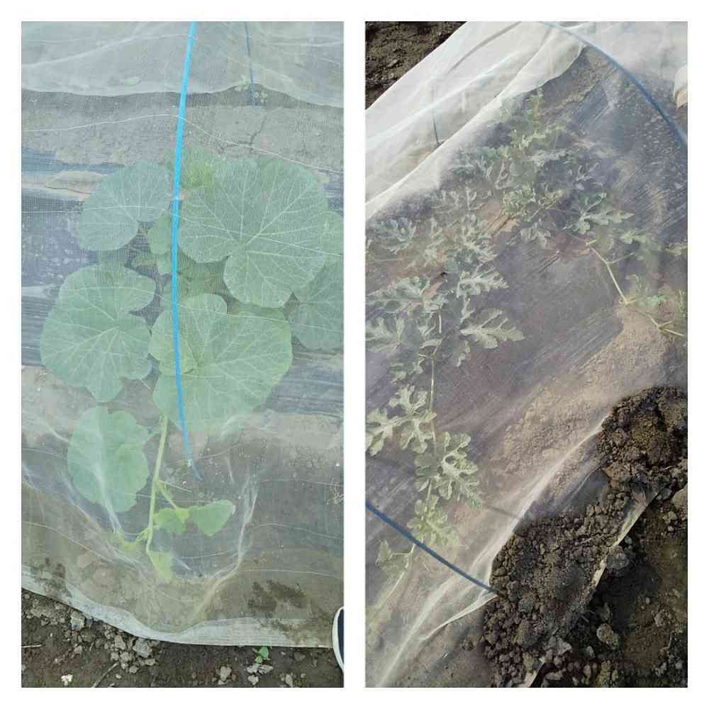 ゴーヤと同時期に植えた「坊っちゃんかぼちゃ」と「スイカ(ラグビーボール状)」の苗も大きくなり、トンネルの壁にぶつかっていました。