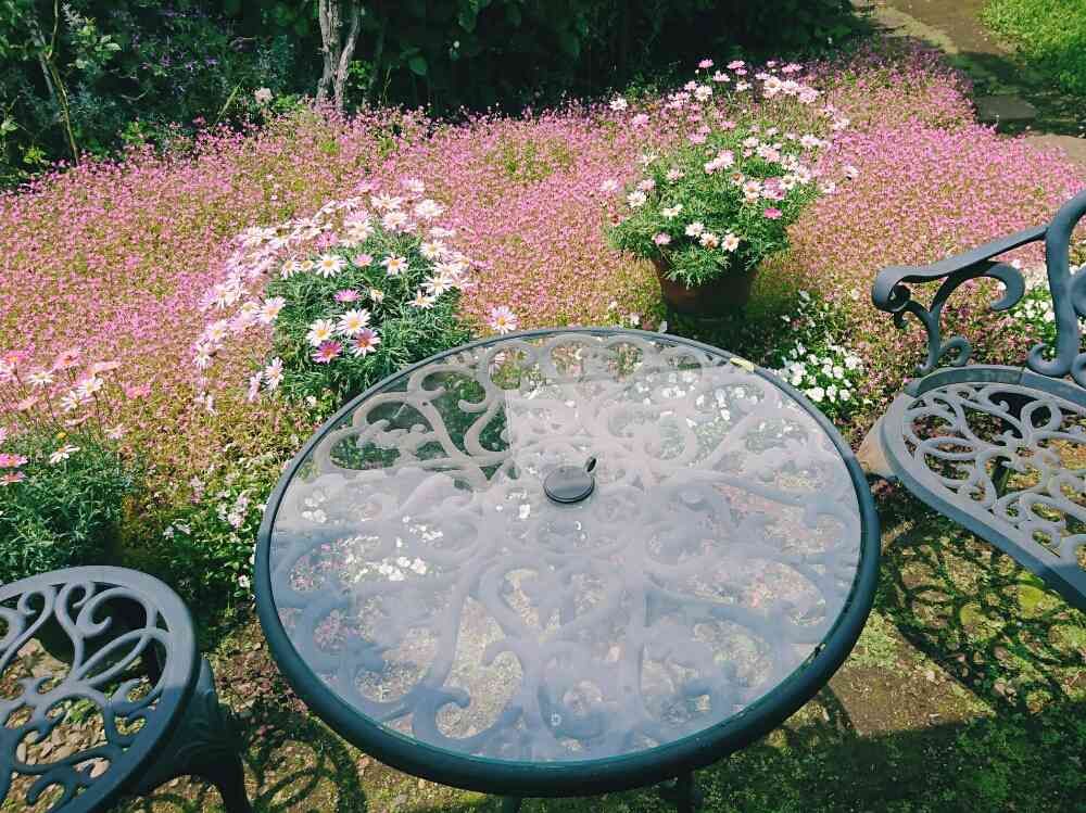 こんにちは😊里子さんのお庭ですね❤️素敵なテーブルと椅子☕️したいですね😆みどりのまとめ、楽しみです❤️