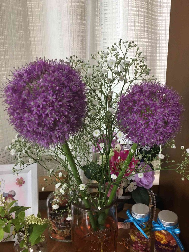 アリウムの茎からの色素で水が濁ってますが、パチリしたあと、すぐお水を替えました。