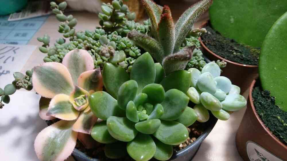 ダイソーさんの多肉達4種(不明、分かる方教えて下さい)と道端のセダム?を寄せ植えしました。