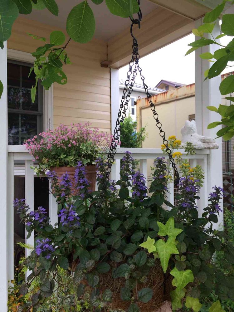 玄関前のスモークツリーから吊るしたハンギングの銅葉のアジュガが地味に可愛いです❤️