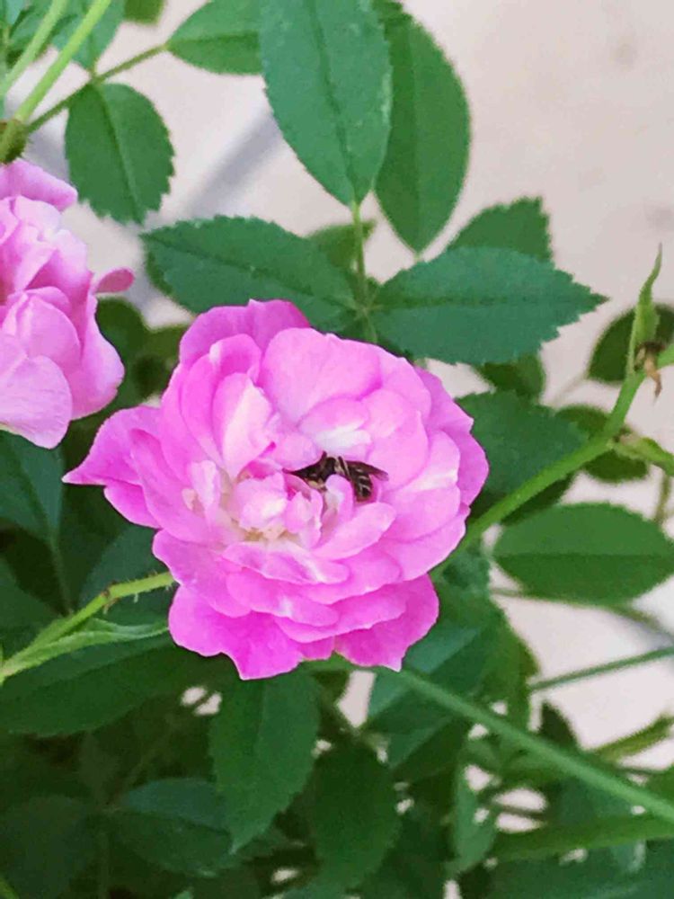 小さなミニバラに小さな蜂が、蜜を集める、と言うよりベッドにしてるようにゴロゴロしていました👀
